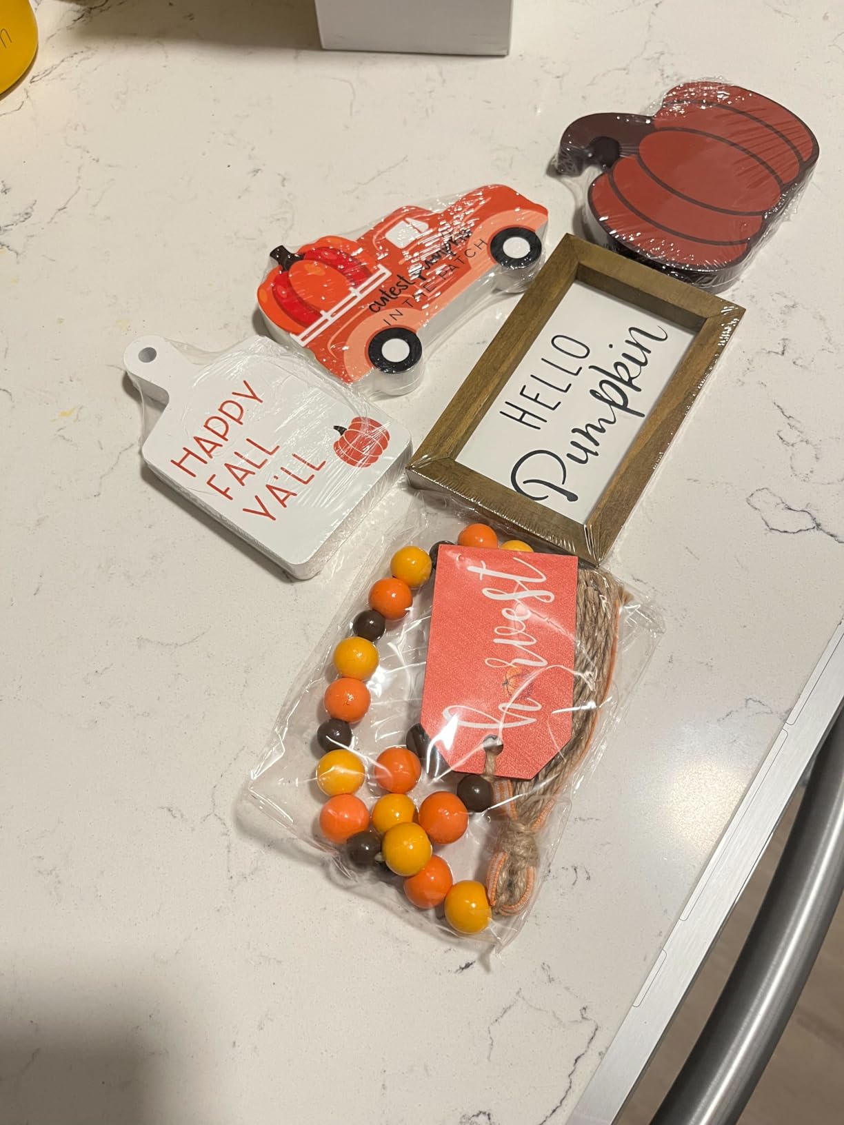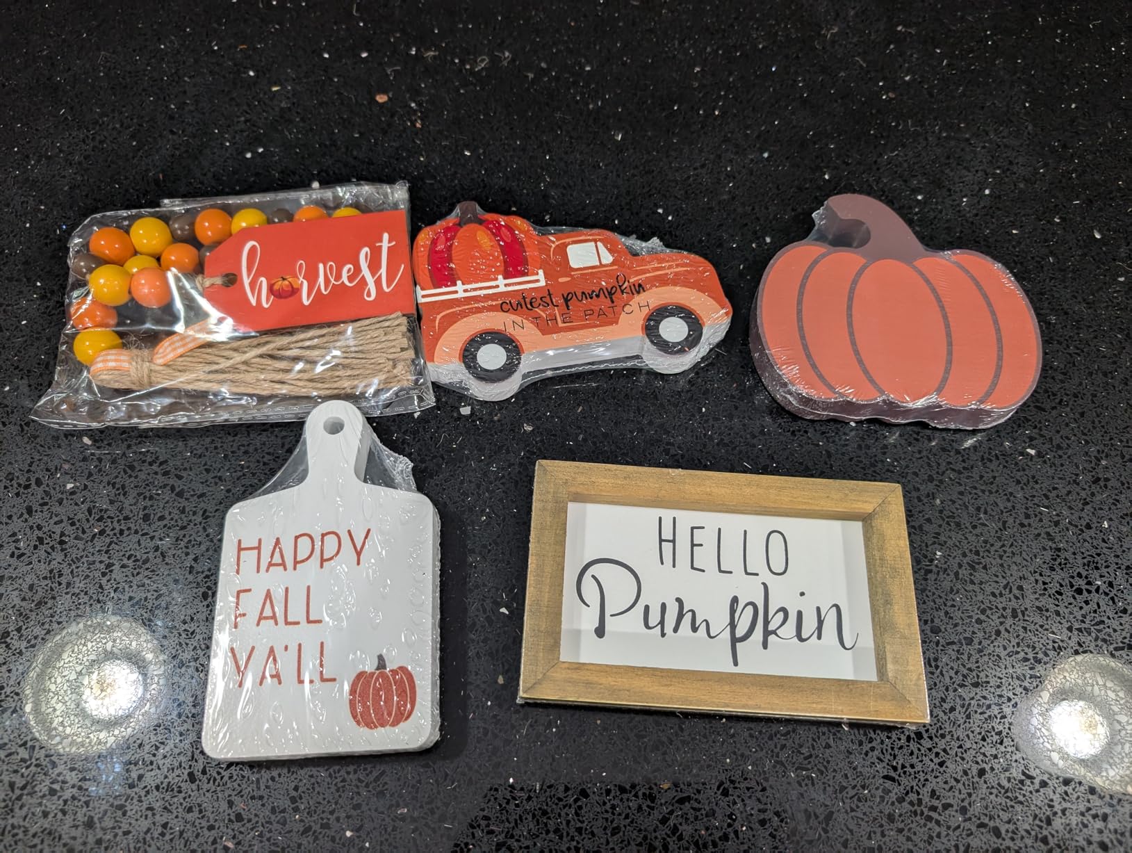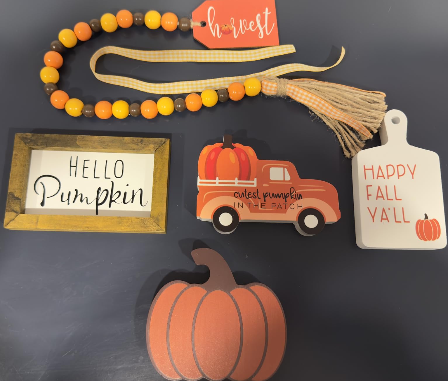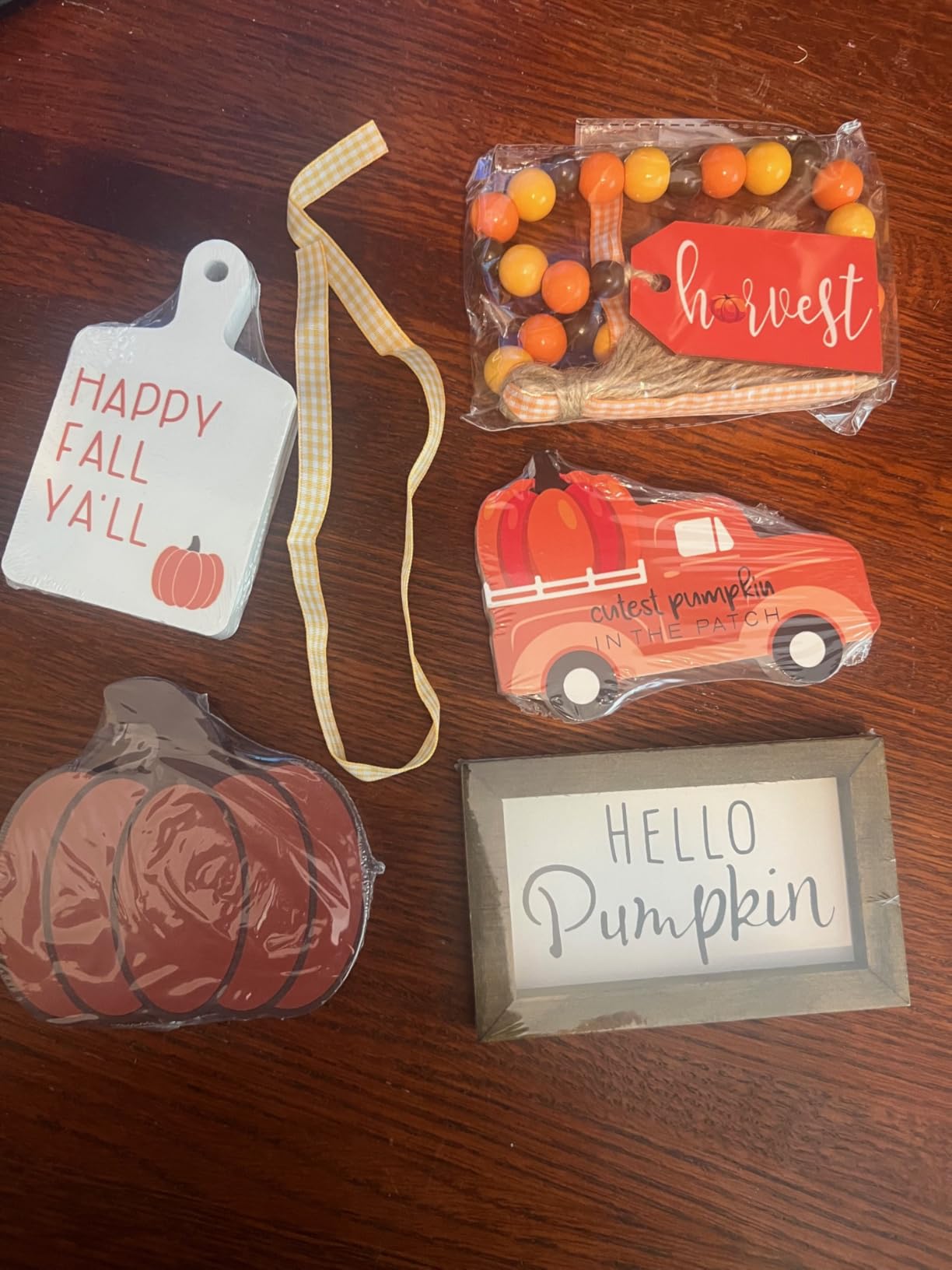 The set includes 5 pieces: a retro frame, a mini cutboard, a small truck, a cute pumpkin, and a harvest bead garland.