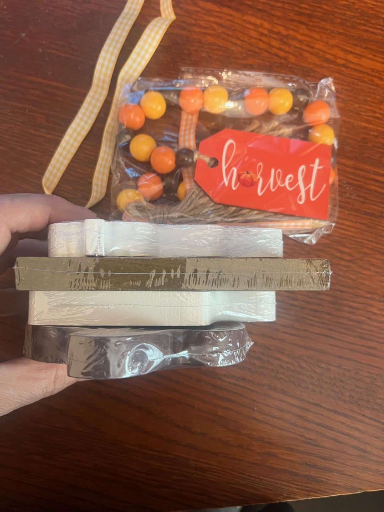 The retro frame measures 4.72x3.35 inches, the mini cutboard is 2.76x4.72 inches, the small truck is 4.72x2.36 inches, the cute pumpkin is 4.33x3.94 inches, and the harvest bead garland is 20 inches long.