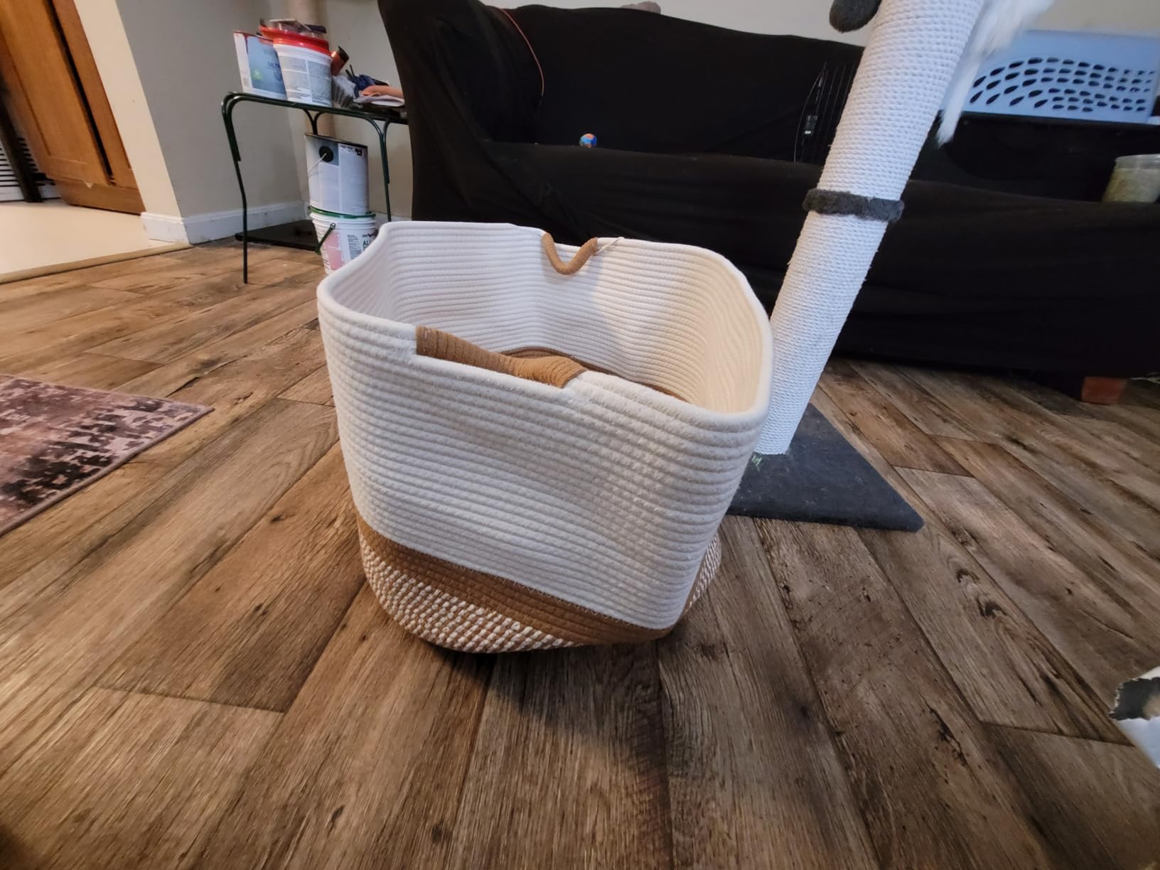 The Large Blanket Basket is made of 100% natural cotton, ensuring it is soft, durable, and free from harmful chemicals.